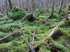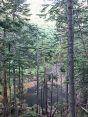 赤く大きな三角屋根の麦草ヒュッテに立ち寄ったのち、R299を横断して、シラビソやアオモリトドマツ、コメツガなどの針葉樹林帯の中の登山道に入る。すぐに茶水の池があり、左に大石峠・茶臼山への道を分けて、右の雨池・八柱山への道に入り、木道で池を渡る。岩石帯に針葉樹が密生し、林床の苔が見事。はじめは木道が敷かれていて、歩き易い。