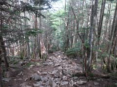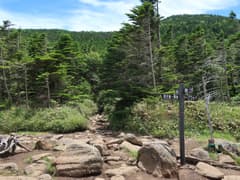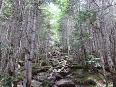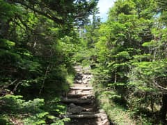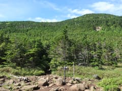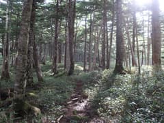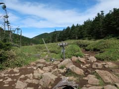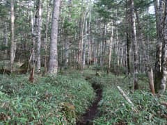 雨池峠への登山道に入ると、樹林に覆われた岩石帯の登りとなる。しばらく急な登りが続くが、やがて樹林が低くなって傾斜が緩むと雨池峠に着く。雨池山と縞枯山の間にゆったりと横たわる広い鞍部で、正面(西側)は八丁平と呼ばれる笹原が広がる。