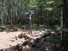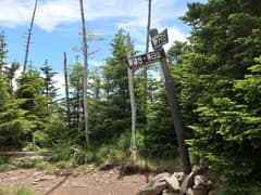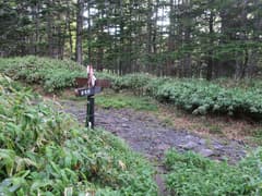 針葉樹林と笹原に覆われたなだらかな頂を越える。この頂上部には樹林に囲まれた小さな池がある。緩斜面を下り、尾根筋が少しはっきりした登りに転じる。途中、「からまつ尾根コース」の古いプレートを見る。右側がカラマツ林となった短い坂を登ると、八柱山の頂上に着く。