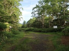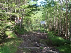 雨池を3/4周した地点から、再び林道大河原峠線に上がる。林道は幅がさらに狭まって、普通の登山道とほぼ変わらない。程なく雨池峠登山口に着く。林道の先には立看板があり、この先の林道(大河原峠線)は双子池入口までの区間、落石の危険があるため、全ての通行・立入は禁止、と書かれている。