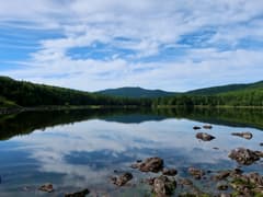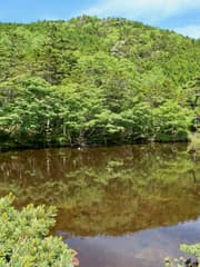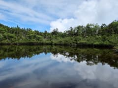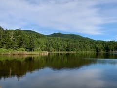 針葉樹林中の木道を歩くと、明るく広々と開けた雨池の湖畔に着く。樹林に縁取られた池はシンと静まり返り、周囲にひと気なし。左手には雨池山から三ッ岳にかけての山々がなだらかに連なり、凪いだ水面にその姿を映す。実に良い風景だ。