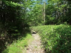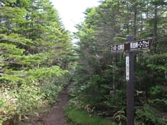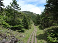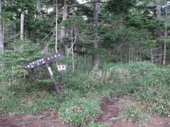 登山道に戻り、針葉樹林と笹原の緩斜面を進むと、未舗装の林道大河原峠線に出る。道標があり、右に行くと八千穂高原自然園・花木園に至る。左に進んで幅の広い登山道という感じで高原情緒のある林道をしばらく辿り、道標に従って右に分かれる登山道に入る。