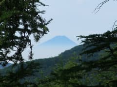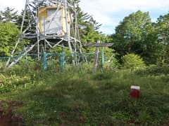頂上はこぢんまりとした草地の平地で、三角点標石と古びた電波塔(宇宙科学研究所・深宇宙探査用大型アンテナコリメーション設備)がある。樹林に囲まれて展望に乏しいが、木の間から浅間山や富士山が眺められる。東南東に落ちるカラマツ林の尾根上には、少し草深いが明瞭な山道が通じている。ちょっと休憩したのち、雨池に戻る。