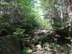 展望台で涼んだのち、茶臼山から樹林帯の中の転石の多い登山道を一直線に下る。ちょっと登り返した岩場には中小場の標識があり、振り返ると茶臼山から結構下って来たことがわかる。