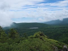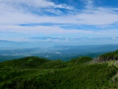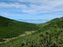 後は麦草峠へ下るだけなので、のんびり休憩。西面には森林に覆われたなだらかな大斜面が広がり、その中に北八ヶ岳ロープウェイの山麓駅や蓼科の別荘地が点在する。陽射しは強いが、西麓から間断なく風が吹き上がって来て涼しく、非常に心地良い。時刻は14時で、一日で最も暑い時間帯だが、ここは全くの暑さ知らずだ。下界は今日も暑いだろうなあ(後日調べると、桐生のこの日の最高気温は37.7℃ ^^;)。