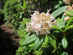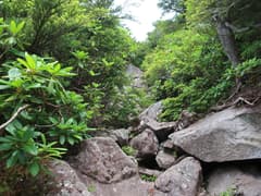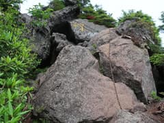 Ⅲ峰からは急な岩場の下りとなり、ちょっとした鎖場もある。下っても溶岩台地の岩石帯の歩きが続く。この辺りでハイカーさん数組とすれ違う。周りの樹林中にはハクサンシャクナゲが多いが、花はもう終盤を迎えている。