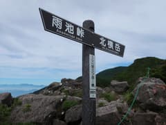 雨池峠から北の雨池山に取り付く。樹林中の岩の多い道を直登すると、「雨池山展望台」の道標のある岩場に登り着く。名に違わず眺めが良く、振り返って雨池峠を挟んで縞枯山を望み、右手にはロープウェイ駅とその向こうに中央アルプスや御嶽山を遠望する。