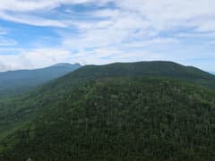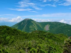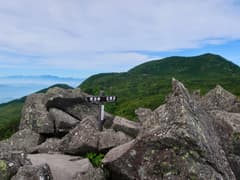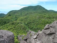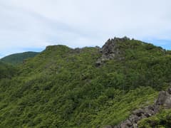 展望台から緩く登ると雨池山の頂上だが、単なる登山道の途中で、樹林に覆われて展望もない。三ッ岳に向かい、樹林に覆われた鞍部に下る。登りに転じて岩石帯を急登すると、三ッ岳Ⅰ峰の標識のある岩峰の上に出る。見晴らしが良く、風通しも良くて涼しいので、腰を下ろして一休み。巨石が積み重なる三ッ岳Ⅱ峰、Ⅲ峰を間近に眺め、振り返って雨池や、なだらかな山容の雨池山と縞枯山を望む。