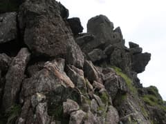 Ⅰ峰からさらに奥へ、巨石を飛び渡ってⅡ峰への登りに取り付く。鎖場を登ると巨石が累々と積み重なるⅡ峰の頂上に着く(標識有り)。岩と岩の間は深く、万一落ちるとタダではすまない。右(北)側は溶岩台地で、台地を挟んで前回登った大岳のピークが眺められる。ペンキのマーキングを頼りに巨石帯を進むと、三ッ岳最高地点のⅢ峰頂上に着く(ここにも標識有り)。北横岳やその手前の北横岳ヒュッテが間近に眺められる。