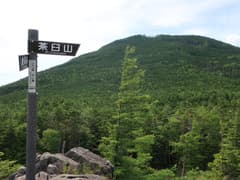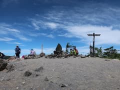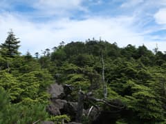 雨池峠から縞枯山の登りに取り付く。こちらも針葉樹林帯の中の石がゴロゴロの急坂で、おまけに後ろに若い女性ハイカーさんが後からピッタリ付いて来るものだから、何となくペースが上がって、縞枯山の頂上に登り着いたときには大汗をかいていた。