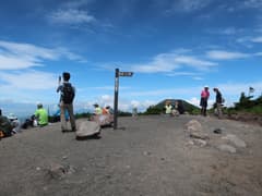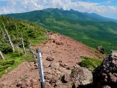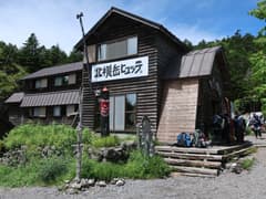 やがて「三ッ岳分岐」の道標のある地点でロープウェイ駅からの道に合流すると、一気に老若男女様々なハイカーさんの数が増えて、メインコースの賑わいを見せる。登山道もグッと歩き易くなり、少し登って北横岳ヒュッテに着く。