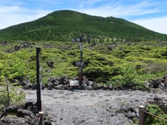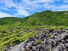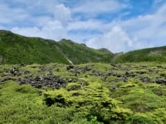 ロープウェイ駅から来た道を戻り、そのまま雨池峠に向かう。木製通路から木道になるが、歩き易いことに変わりない。狭い谷の左側は溶岩台地の末端で、溶岩の崖が迫る。