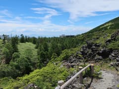 北横岳からヒュッテを経て三ッ岳分岐まで戻り、ここからロープウェイ駅方面へ向かう。溶岩原の坪庭を俯瞰する急斜面に付けられた道を下るが、斜めにトラバースしているので、きつい下りはない。坪庭に下り着き、坪庭を一周する遊歩道に合流する。