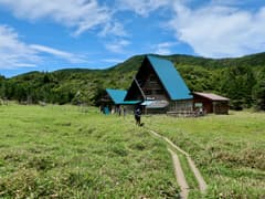 やがて谷が開けて笹原が広がると、大きな青い三角屋根の縞枯山荘が建つ。この山荘も麦草山荘と同じくレトロな味わいのある山小屋だ。ここまでは観光客もやって来ている。