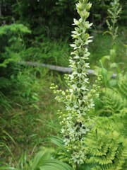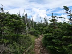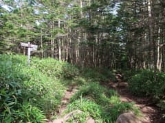 二人連れハイカーさんには先に行って貰い、5分程休憩してからリスタート。樹高の低い針葉樹に覆われた平坦な頂上稜線を進む。バイケイソウが多く、いくつか咲き始めた株の花には、小さなカミキリムシが蜜を吸いにたくさん来ている。