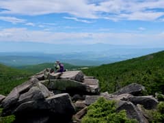 頂上稜線の末端で縦走路から分岐し(道標あり)、ちょっと脇道に入った所に縞枯山展望台がある。先程のハイカーさん二人を含め数組が休憩中。森林から抜きん出て巨石が積み重なったピークで、四方に渡って眺めが良い。