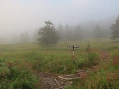 麦草峠へのアプローチは前回と同じ。桐生を深夜2時頃に車で出発。八千穂高原ICで高速を降り、R299(別名メルヘン街道)を上がって、麦草峠の登山者用駐車場に車を置く。駐車場は4割の入り。外は霧に覆われて、車の外気温計は17℃を示している。ここはやはり涼しい。朝食にパンを齧ったのち、出発する。