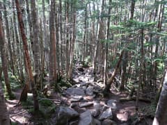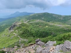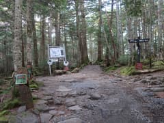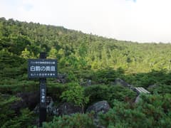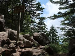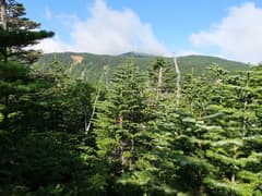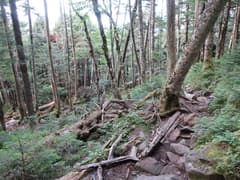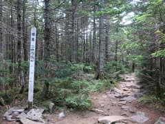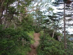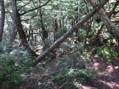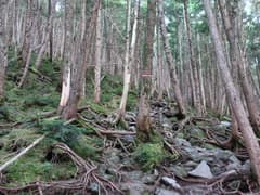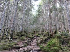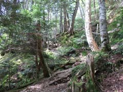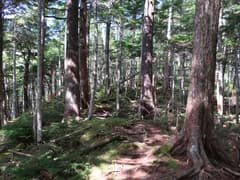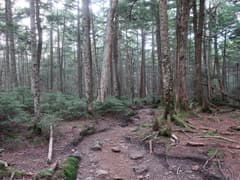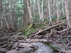 稲子湯への道を左に分け、ニュウに向かって岩石帯にコメツガの根が絡まる道を登る。稲子湯から直登して来た道を左から合わせると、広くなだらかな尾根の上の道となる。ハイカーさん数組と交差。昨晩は上で泊まったのだろう。