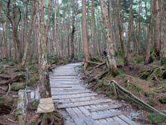 R299沿いの有料駐車場からの道に合流。板敷の立派な歩道で、さらに歩き易い。この辺りは「白駒の森」という。常連らしきハイカーさんに行き会い、最近は雨が少ないせいか、苔にちょっと元気がない、との話を伺う。言われて見てみれば、そんな感じがしないでもない。程なく道は四つ辻となり、左に折れて青苔荘(せいたいそう)に向かう。