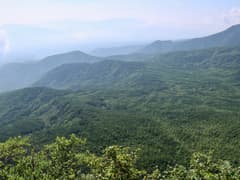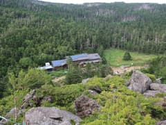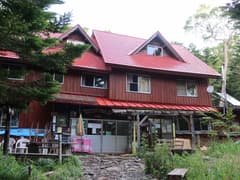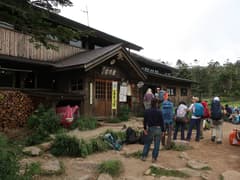 中山展望台から針葉樹林中をほぼ真っ直ぐに下る。傾斜は緩いが、例によって岩が多くて歩き難く、展望もないので、この下りはとても長く感じる。ようやく下り切って、少し登り返すと高見石小屋に着く。