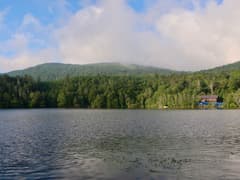 青苔荘の前には、早朝にも関わらず人が多い。宿泊したお客さんが結構いるようだ。林間のキャンプ場にも多数のテントが張られ、朝食の準備をしている人達も。岸に降りて、白駒池を見渡す。水は深く透き通っている。対岸には白駒荘が見え、その後ろには鬱蒼と繁る針葉樹林に覆われたなだらかな山がゆったりと広がる。