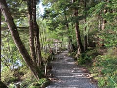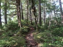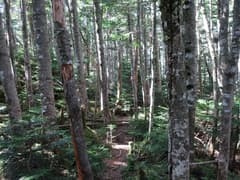再びオオシラビソなどの針葉樹林帯に入って緩く登る。今日、見た中では、この辺り(にゅうの森)の苔が一番青々、ふかふかとした感じ。大荷物のソロハイカーさんに追い付いて、泊まりですか、と伺うと、今日はミドリ池にテント泊とのこと。それもいいなあ。