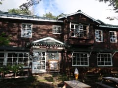 池の岸を左回りに辿ると、四つ辻から来た遊歩道に合流して、白駒荘に着く。手前の新館はブルーシートで囲われて工事中で、人もいなくて静かだ。しかし、奥の本館の玄関には軽食メニューの看板が出ているので、こちらは営業しているらしい。