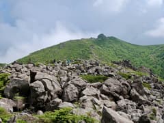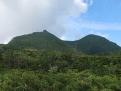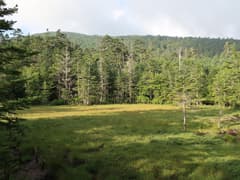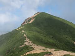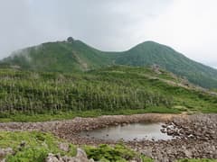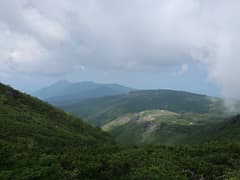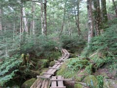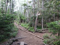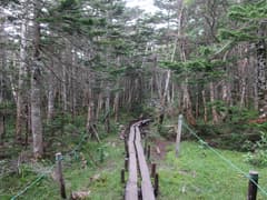 登山道を中山峠に向かう。ここは今日一番の急登。針葉樹林帯をジグザグに登る。最後は草に覆われたガレを登って、中山峠に着く。峠を越す道は木道となり、黒百合平へ緩く下っている。
