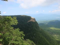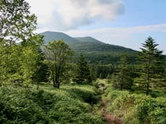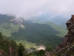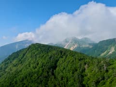 峠から少し登った地点に「見晴らし台」の標識があり、樹林の間から稲子岳と南壁が眺められる。右側は稲子岳との間の凹地に切れ落ちる急斜面で、その縁を緩く登る。ニュウへの道を右に分け、広く平坦な針葉樹林帯の中の道を進む。岩石帯を緩く登り、樹林に入ると中山頂上に着く。眺めは全くないので通過。