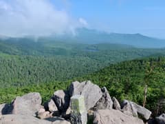 天狗岳頂上は低いハイマツに囲まれた広場となり、三角点標石と風化した石仏、石碑がある。こちらの頂もハイカーさんで大賑わい。広場の片隅に腰を降ろして昼食にする。まずはレトルト鯖味噌煮をつまみにノンアルで喉を潤し、カップ麺の酸辣湯麺を食べる。これ、酸味が効いて、夏バテで食欲減退気味でも美味しく食べられるな。