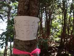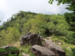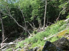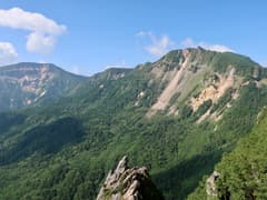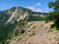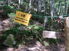 中山峠との鞍部に下り、樹林に覆われた岩石帯の踏み跡を辿ると、崩壊地に突き当たる。急斜面に岩角が新しく鋭い巨石が山積し、ここは落石に要注意。崩壊に沿って少し下り、テープの目印に従って崩壊地を横断する。さらに樹林をトラバースすると、ミドリ池から中山峠への登山道の途中に出る。ここには「⚠︎注意 この先、稲子岩壁ルートにつき、関係者以外進入ご遠慮ください。」との警告看板がある。