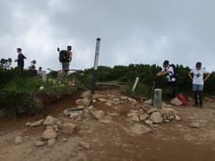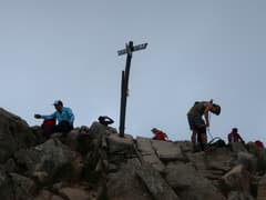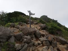 頂上はハイカーさんで大賑わい。雲が出て展望は遮られてしまったが、360度に開けた頂だ。振り返ると、垂れ込めた雲の下に稲子岳が見える。ここには長居せず、すぐに天狗岳(西天狗)に向かう。