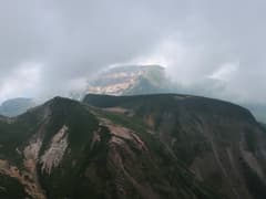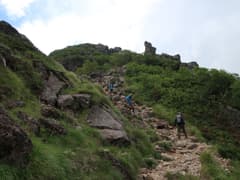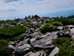 傾斜が増した尾根を登り、黒百合平からの登山道を合わせる。岩峰を右から巻き、左に切れ落ちた崩壊斜面を見て最後の坂を登ると、東天狗の頂上に着く。