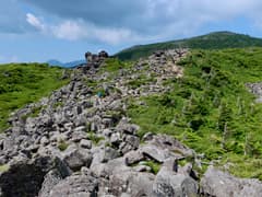 小休憩したのち、天狗岳へ向かう。天狗岳登山のメインルートらしく、ハイカーさんの数が格段に増える。樹林帯と岩石帯が混ざる尾根道を登る。日の当たるザレにはトウヤクリンドウがたくさん咲いている。行く手に東天狗と西天狗の双耳峰を望み、登山道を歩くハイカーさんが点々と見える。右手には溶岩台地が広がり、黒百合平から天狗の奥庭を経由して東天狗に登る道が眺められる。あちらの道も人影が多い。