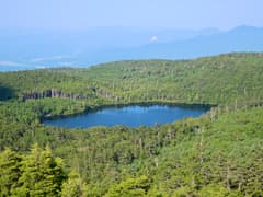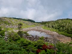 ひとしきり下って、少し登り返すと「天狗の奥庭上」の道標がある。ここから溶岩台地上の道となる。振り返ると、東天狗に向かって岩石帯が延びる。あそこを下って来て、さらにこの先、天狗の奥庭と称する岩石帯が続くから、なかなか難儀なルートだ。すりばち池に近づいて、岩石の丘に囲まれた水面を見おろす。自然の庭園の景観が素晴らしい。