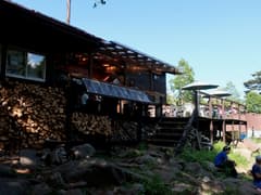 高見石小屋の前もハイカーさんで大賑わいだ。テラスのテーブルではビールを飲んでいるグループも。名物の揚げパンでも買っておやつに食べようかと思ったが、もう終わっている雰囲気だったので、ペットボトルのオレンジジュース(300円)を買って飲む。冷たくて一息つけた。