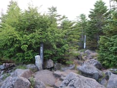 高見石小屋に戻り、今日最後のピークの丸山に向かう。渋の湯への道を左に、続いて白駒池への道を右に分ける。XCツアースキーコースの古い看板があるが、樹林帯の中なのに滑るところがあるんだろうか。一直線の急坂を頑張って登ると「丸山頂上」の標識と石標に着く。しかし、その奥の登山道が右折する地点にも石標があり、これが三角点標石らしい(未確認)。まあ、平らな頂だし、僅かな距離なので、どっちが頂上でもいいか(^^;)