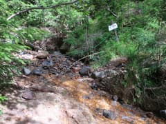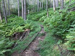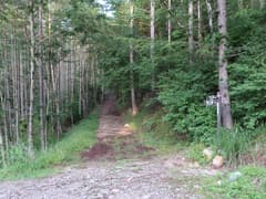 白駒林道のゲートの所に「稲子湯唐沢橋登山口」の案内板と登山者カード入のポストがある。登山計画書はいつもの通りコンパスから事前に提出済み。唐沢橋を渡って、すぐに登山道に入る。シダが下生えに茂るカラマツ林を緩く登り、林道を数回横切る。
