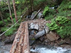 林道のコンクリート橋を渡り、道標に従ってこまどり沢左岸の作業道を辿る。以前は右岸に登山道が通じていたが、間伐作業中のため、道が付け替わったとのこと。木橋で沢を渡ると再び山道となる。