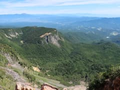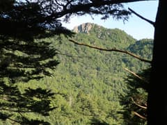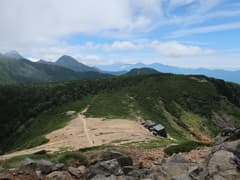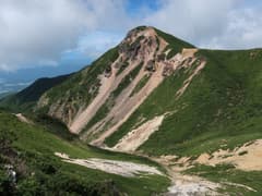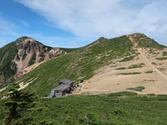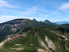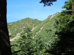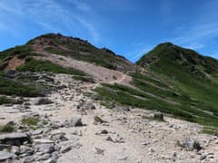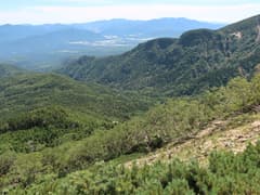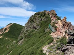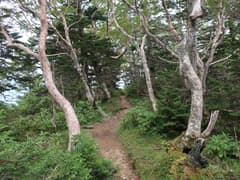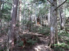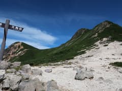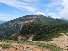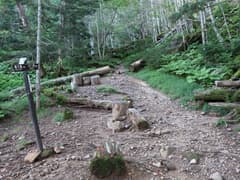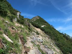 ここから白砂新道で東天狗に向かう。沢を二つ渡るとシラビソやダケカンバの樹林帯の急登となる。所々、木立を透かして硫黄岳の爆裂火口の断崖が見えるくらいで、展望には乏しい。小尾根上の登りとなると、頭上に根石岳の稜線が垣間見える。「頂上まで後十五分」との古い道標を過ぎると、ダケカンバとハイマツ、草地の急斜面に差し掛かり、背後に開ける展望を時々見ながらジグザグに上がって、根石岳と東天狗の鞍部に登り着く。