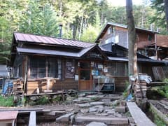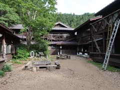 トラバースから下りの道となり、松原湖からの幅広い道に合流する。「本沢♨︎クリン草園」の標識のある群生地とキャンプ場を通ると、硫化水素の臭いの漂う本沢温泉に着く。宿泊客が出発した頃合いだからか、ここも人の動く気配がない。売店の前に山水を引いた水場があり、冷たい水を頂いて一休みする。