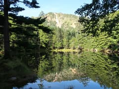 しらびそ小屋はミドリ池の畔に建つ古風な雰囲気の山小屋だ。朝早いためか、人が動く気配はない。小屋は池を隔てて東天狗を眺める絶好の立地にある。朝日を浴びた東天狗が、凪いで滑らかな水面に鏡写しとなって美しい。池の畔を少し進むと、岩壁を擁して聳える稲子岳も見える。前回、稲子岳からミドリ池を俯瞰して、あの池に行ってみたいと思ったのが今回の山行の動機の一つだから、この景色を見ることが出来て、来た甲斐があった。