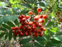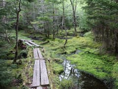 池の畔から平坦な樹林帯に入り、中山峠への道を右に分け、湿原や川を木道で渡る。花の終わったクリンソウの群落があり、たくさん実が付けている。やがて緩く登って、山腹をトラバースする道となる。