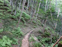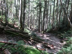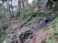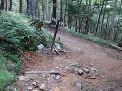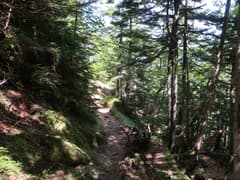 やがて森林軌道の跡が現れ、山道はこれを辿る。軌道跡は鉄道とは思えないくらい半径が小さなヘアピンカーブを連ねて、斜面を登って行く。「ここはこまどり沢 みどり池がんばって!40分」の標識のある地点から傾斜が増して、苔むした針葉樹林帯をジグザグに登る。展望はなく、木の間からニュウの岩峰がチラと見える程度。傾斜が緩み、キャンプ場入口を通って、標識から20分強でミドリ池としらびそ小屋に着く。