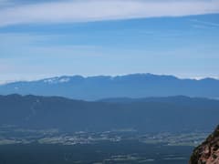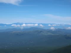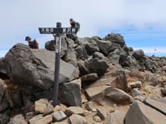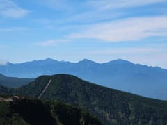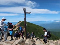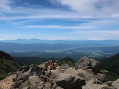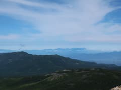 前回の登頂では雲に覆われてイマイチの展望だったが、今回は青空が広がって空気が澄み、360度どちらも遠くまでくっきり見える。南には硫黄岳の円頂が大きく、その奥に赤岳と阿弥陀岳が鋭く天を指す。そこから目を右へ転じれば、南アの北岳、甲斐駒、仙丈、さらに中ア、北アの槍、穂高、頸城山塊の火打、妙高まで眺められる。また西から北にかけては奥秩父、西上州、浅間連峰の山並みが広がる。この展望は素晴らしい。再訪して良かった。山岳展望を堪能するが、睡眠不足で疲れが出たので、頂上の片隅で昼寝する。