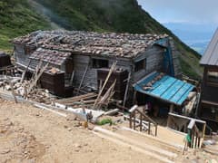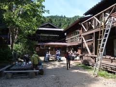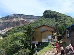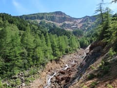 ガレ沢の上に壮絶な爆裂火口壁を巡らせる硫黄岳を仰ぎ見て、本沢温泉に戻り着く。宿の前は今晩の宿泊客だろうか、大勢のハイカーさんが休憩中 or 宴会中で、今朝とは打って変わって賑わっている。あとは往路をみどり池入口に戻る。