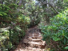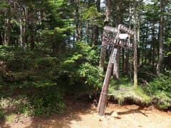 昼食を終え、元気を回復したところで、下山にかかる。根石岳山荘からハイマツの間の階段道を上がり、シャクナゲなどの樹林帯に入ると、すぐに箕冠山(みかぶりやま)の標識のある分岐点に登り着き、オーレン小屋への道を分ける。箕冠山の最高点は明らかに右(西)の樹林の中だが、頂上はここでいいや。夏沢峠への縦走路を進む。