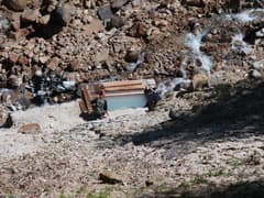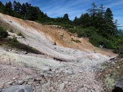 この少し先に硫化水素の臭いの漂うザレ地があり、露天風呂への道が分かれる。ちょうどそちらに手拭いだけの軽装のおじいさん二人が入って行くところだった。露天風呂に浸かりに行くのかあ。いいなあ。私はこのあとも長い歩きがあるから、今日は止めておく。