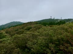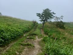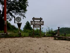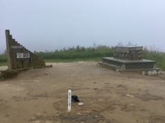 頂上は四方に開けて、天気がよければ大展望が期待できそうだが、今日は雨雲の中で何も見えない。周辺の山の影が薄っすらと見える程度である。写真を数枚撮って引き返す。
