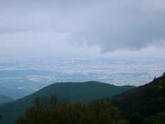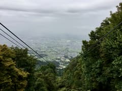 次のロープウェイは16:30発で、十分時間があるから、のんびり歩いて山上駅に戻る。往復40分くらいであった。改札を通り、搬器に乗り込んで、山麓を眺めながら発車時刻を待つ。下りも当然ながら乗客は私一人。大げさに良く言えば、葛城山を貸し切り独占状態でピークハントした(^^;)。山麓駅に到着して駅前から振り返ると、葛城山の上部が雲の間から少しだけ見える。機会があれば再訪して、じっくり歩いて登りたいものである。
